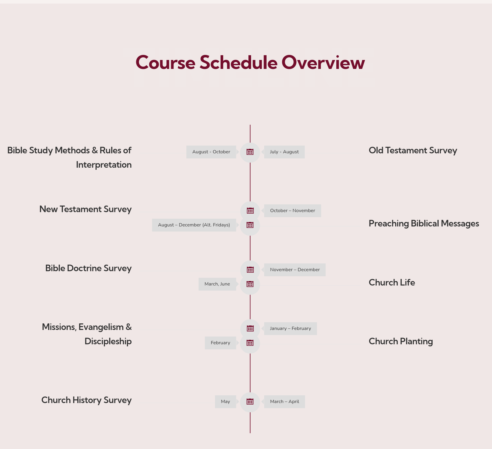 - Church Life (40 hours) – Understand the biblical model for church governance, worship, and community engagement.